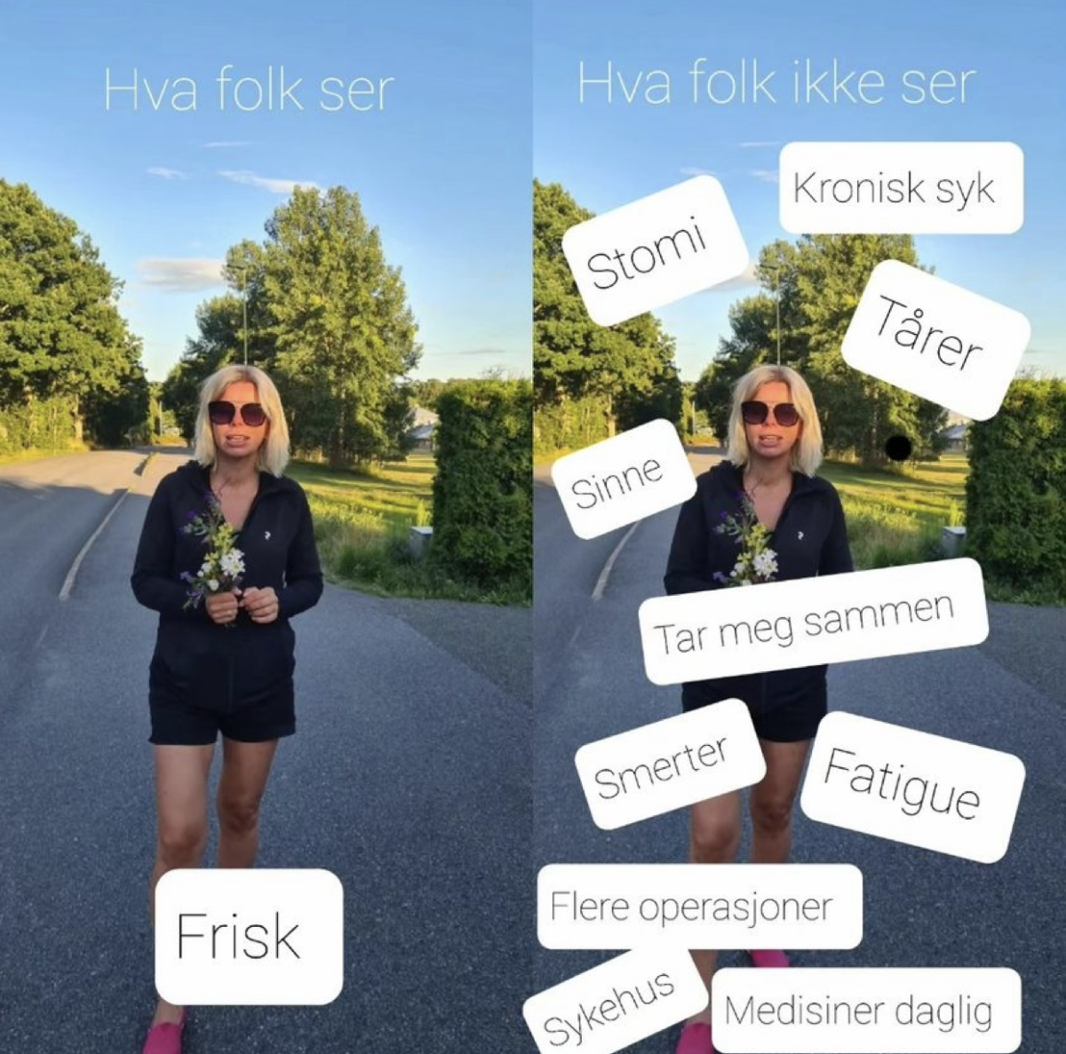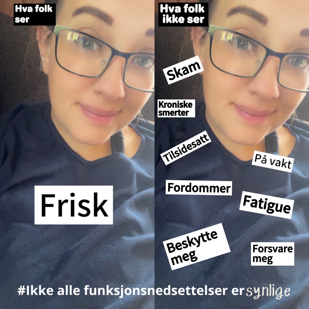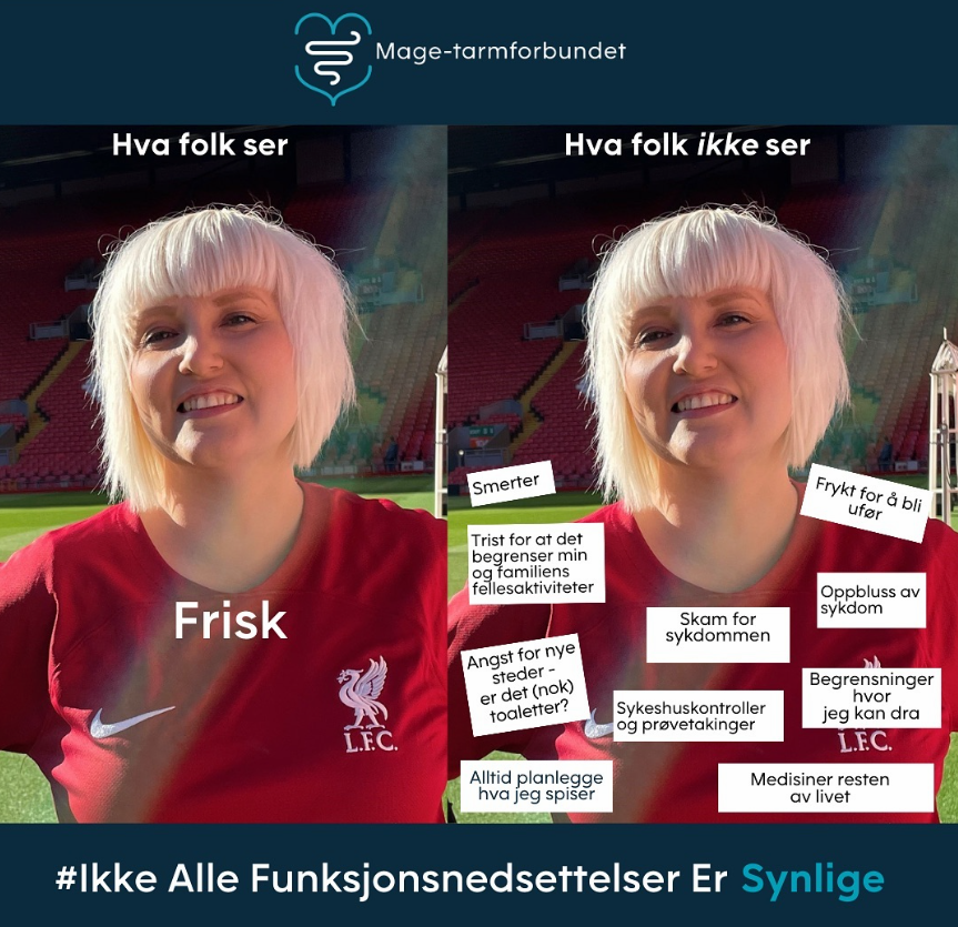 Her utmerket illustrert av mangeårig medlem av Mage-tarmforbundet Wenche Mikalsen som har sett seg lei på tabu og skam knyttet til å være usynlig kronisk syk, og stadig forklaringer om at; Joda, funksjonsnedsettelser de eksisterer selv om de ikke synes på utsiden.