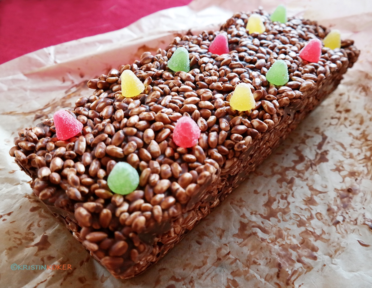 Bruk en stor brødform som fores innvendig med et ark bakepapir. Fordel halvparten av ris/sjololadeblandingen i formen, glatt til med en slikkepott. Ha på marsipanskiver og geletopper etter ønske , dekk med resten av ris/sjokolademassen. Glatt til med slikkepott og pynt med geletopper oppå. Brett papiret forsiktig over toppen av brødformen. Tre hele brødformen inni en stor plastpose (6 liter) og sett den i kjøleskapet til massen har stivnet. Ved servering tas brødformen ut av kjøleskapet: skjær skiver av kaken med skarp kniv og servér med én gang. Sett kaken tilbake i kjøleskapet igjen. Holder seg fint i en uke eller to i kjøleskap.