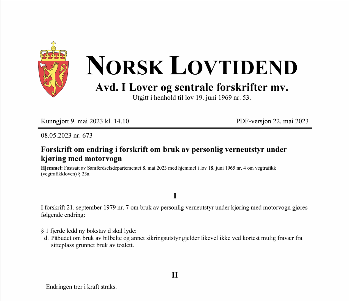 I forskrift om bruk av personlig verneutstyr § 1 fjerde ledd bokstav d kan man nå lese at «Påbudet om bruk av bilbelte og annet sikringsutstyr gjelder likevel ikke ved kortest mulig fravær fra sitteplass grunnet bruk av toalett».